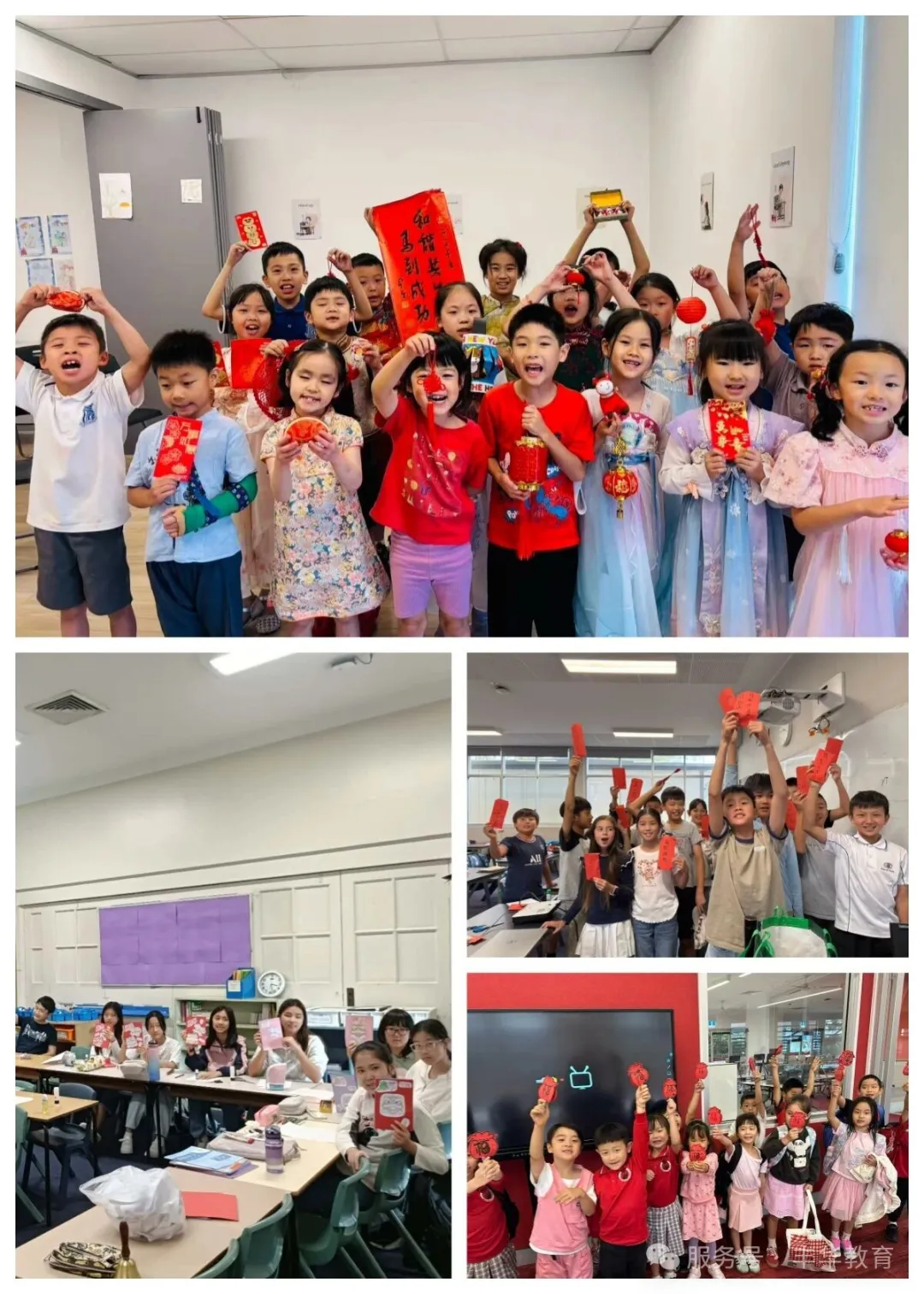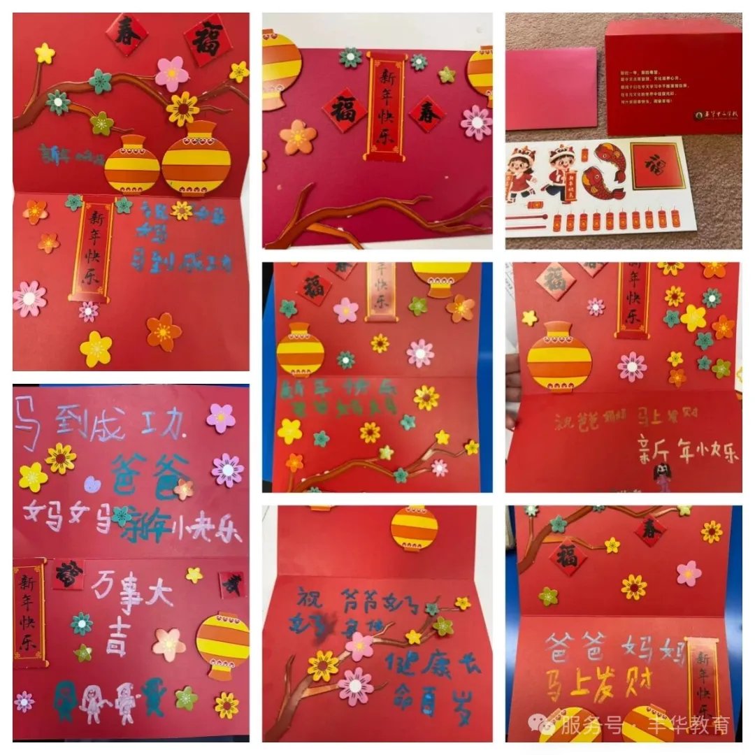 在低年级课堂里,小朋友们读春节故事,唱新年歌曲,跳喜庆舞蹈,在欢声笑语中感受节日的热闹氛围。他们动手制作可爱的小马、红彤彤的红包和精美贺卡,还认真剪出一个个“春”字,把满满的祝福送给爸爸妈妈和亲人。童真的笑容与稚嫩的祝福,让整个教室暖意融融。