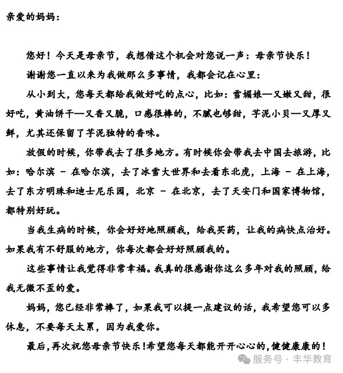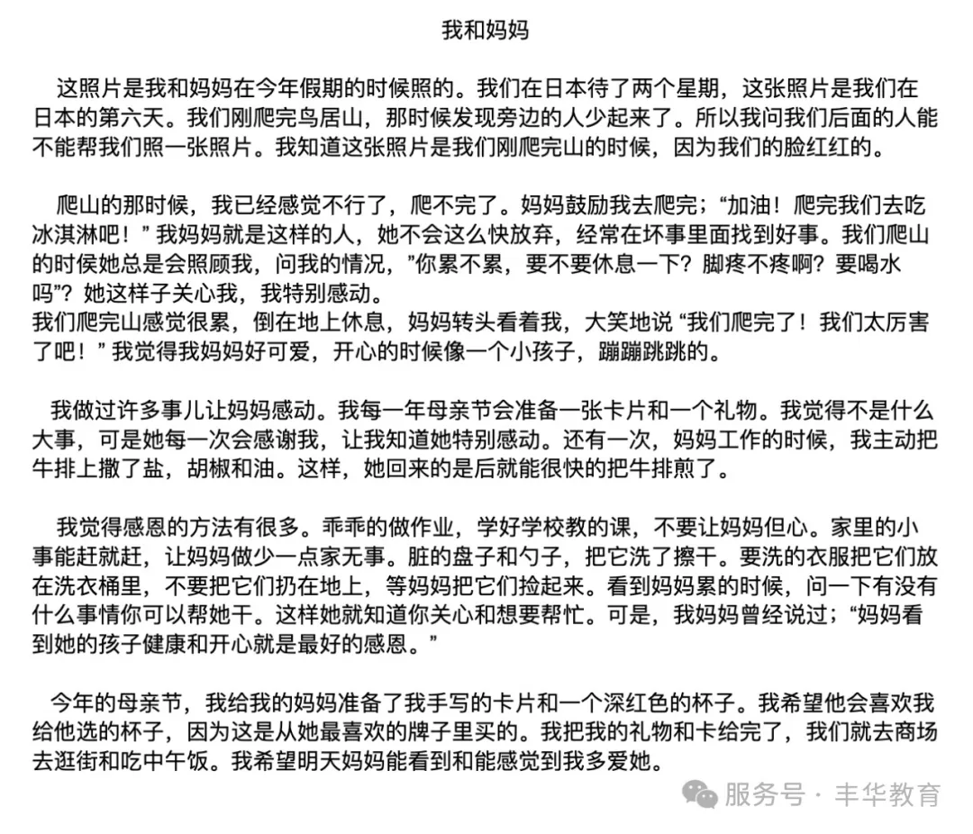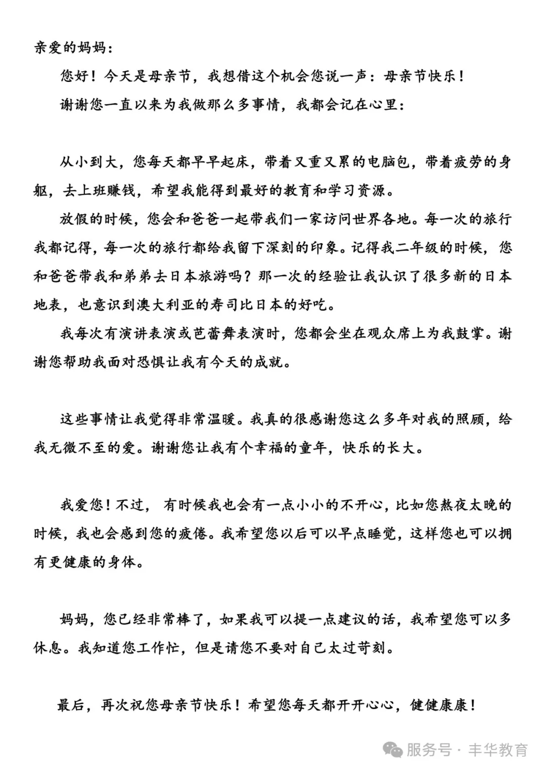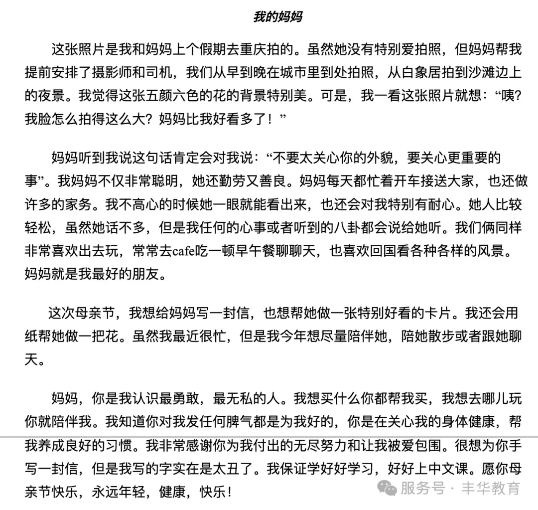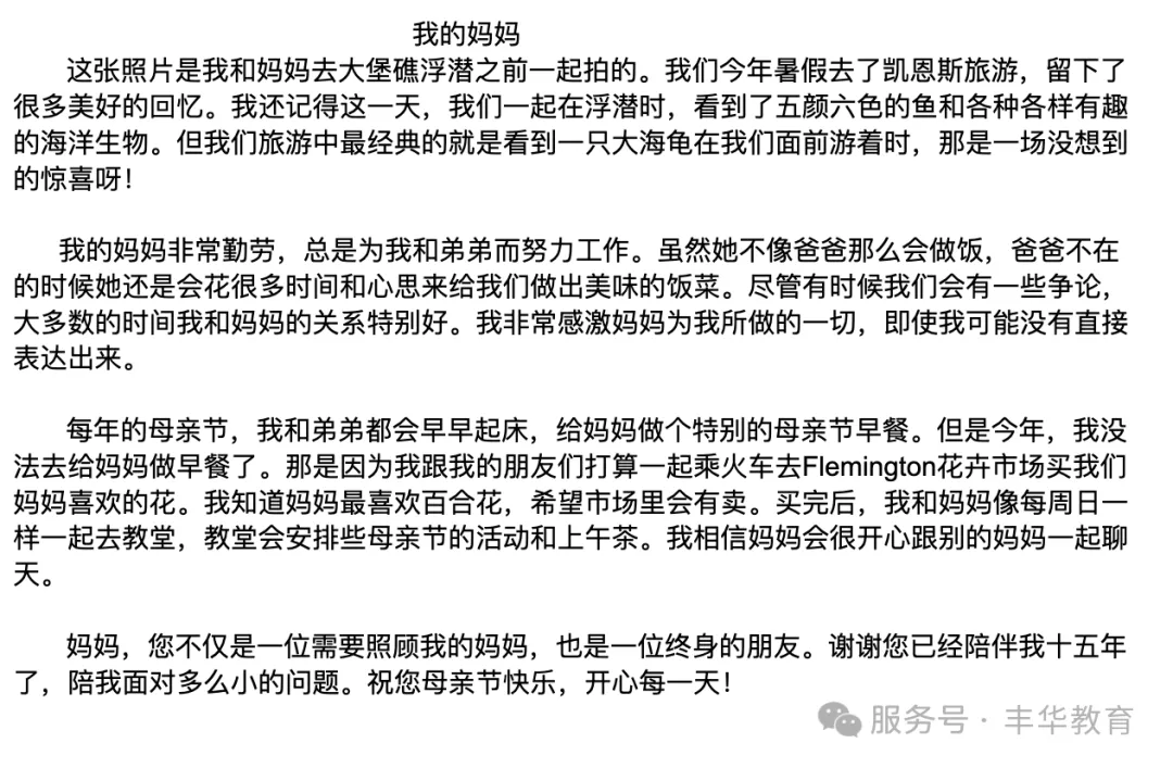 每当母亲节来临时,澳洲的孩子们都会用各种各种的方式表达自己对母亲的爱意和感恩,我们丰华中文学校的同学们也不例外。不同年级的学生以不同方式向母亲表达爱意,用心书写属于自己的“感恩之作”。
