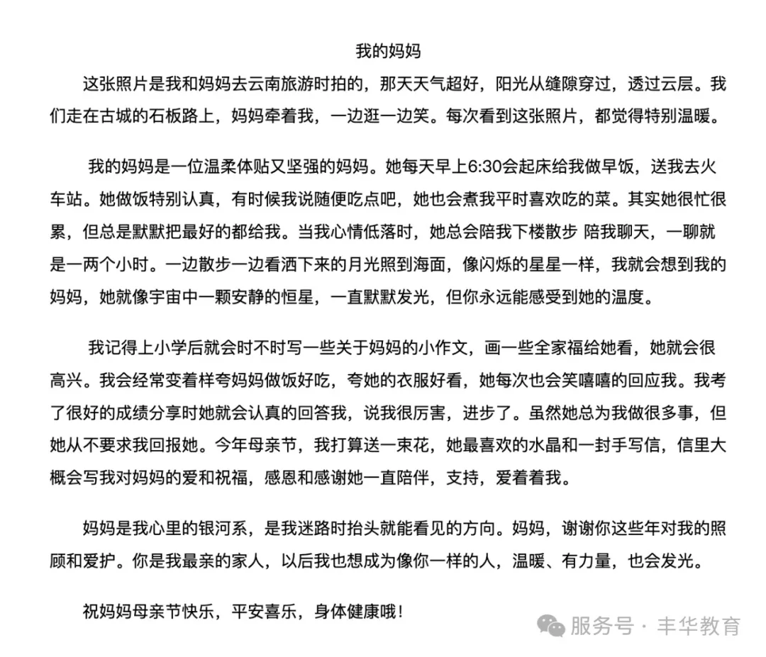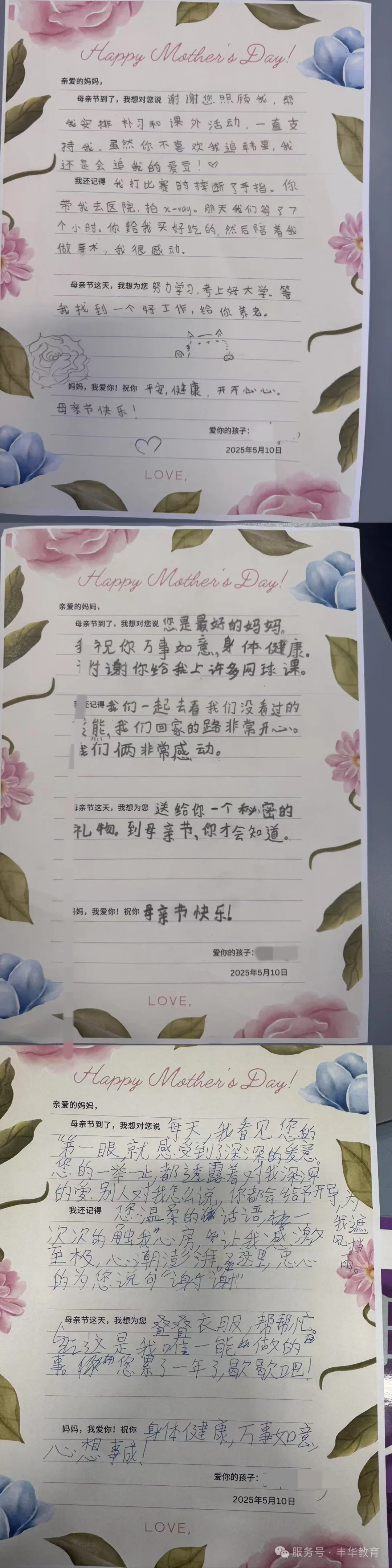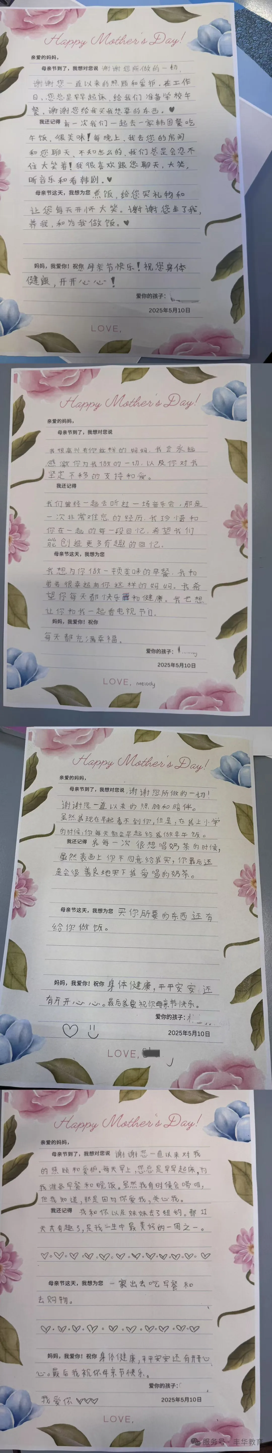 高年级的同学则通过写电子邮件或作文的方式,回顾与母亲之间的温暖回忆,讲述那些让他们难以忘怀的片段。他们学会了理解妈妈的不易,也尝试用文字认真表达内心的感谢。“妈妈是我心里的银河系,是我迷路时抬头就能看见的方向”——这些优美的表达令人动容,也展示了他们在情感与语言上的成长。